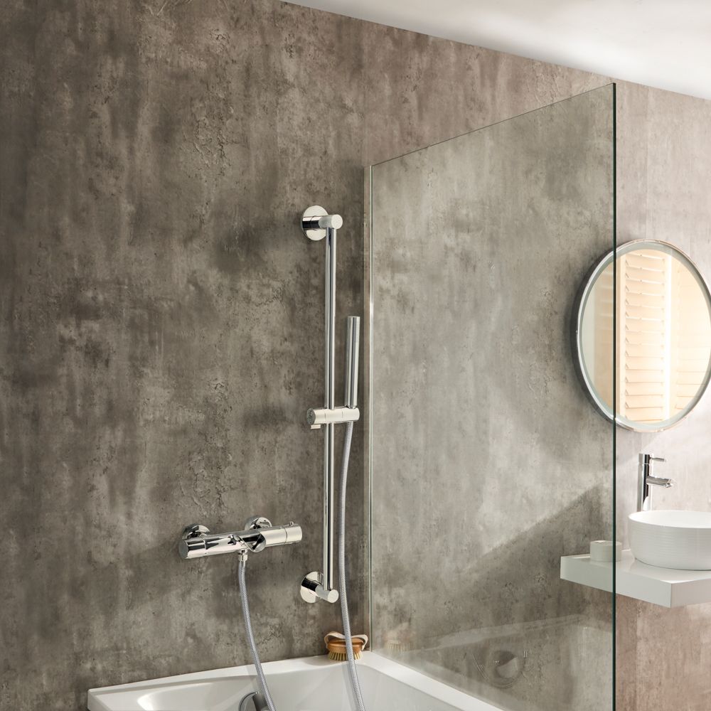The modern Milano Arlo thermostatic bar shower valve with integral bath spout and riser rail kit with hand shower, is perfect for installation over your bath.