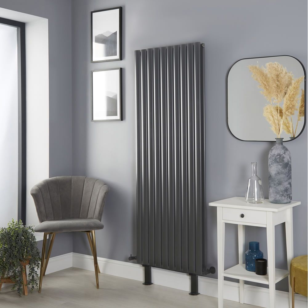 The Milano Aruba anthracite vertical designer radiator, complete with floor-mounting feet, is the perfect blend of form and function.