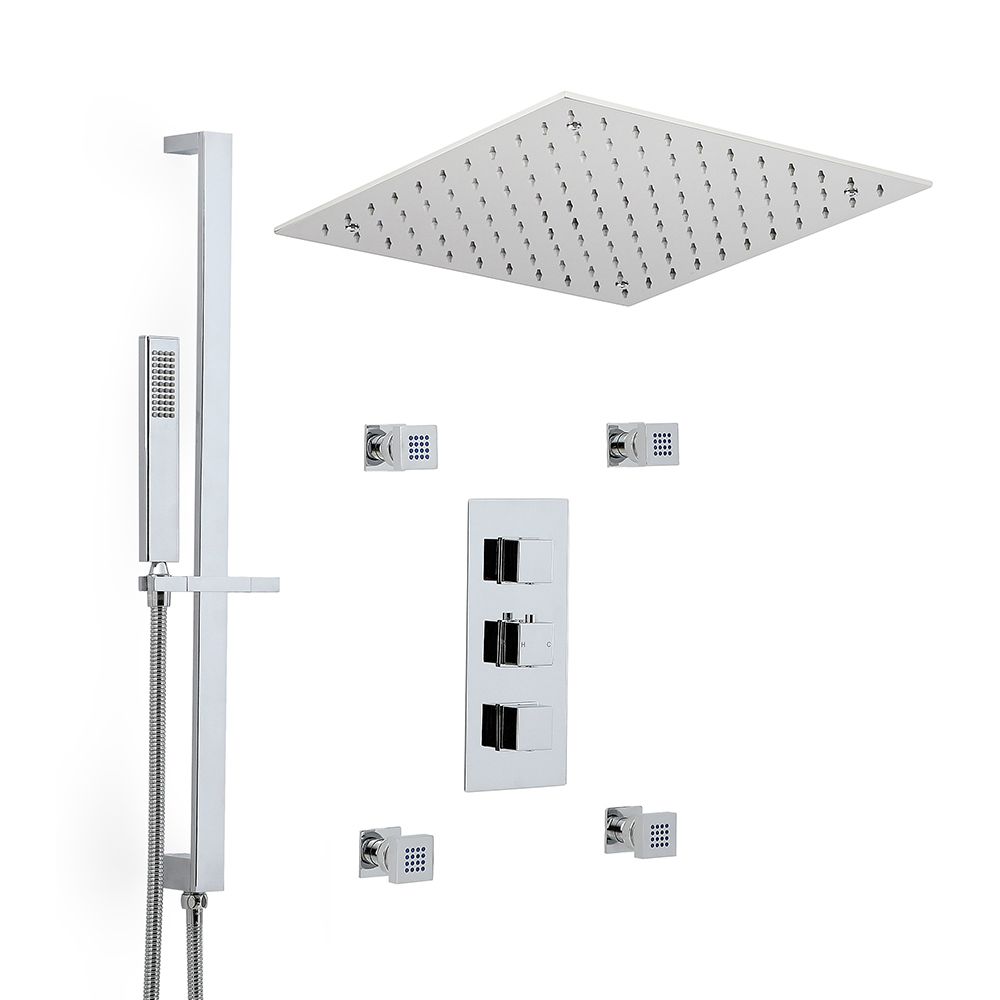 Enjoy a luxurious spa-like shower with the Milano Arvo thermostatic shower mixer set, complete with triple diverter valve, body jets, recessed shower head and riser rail kit.