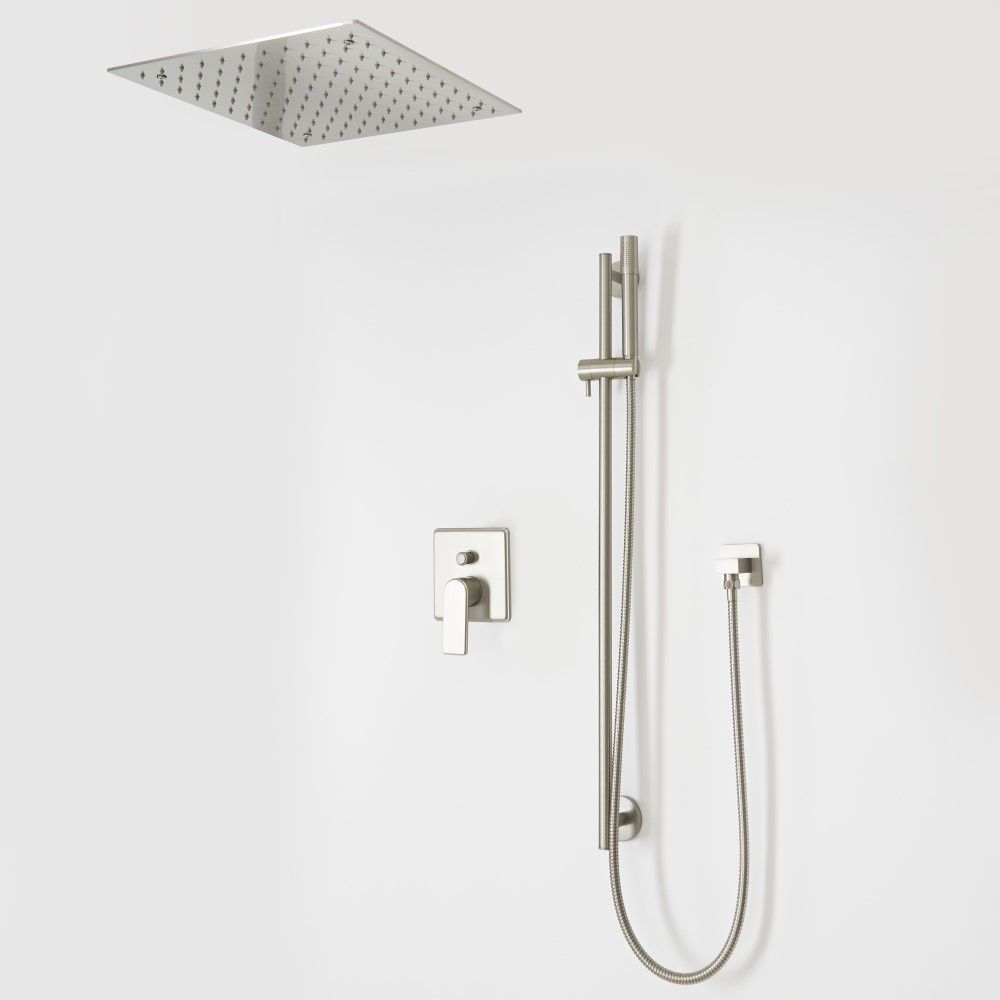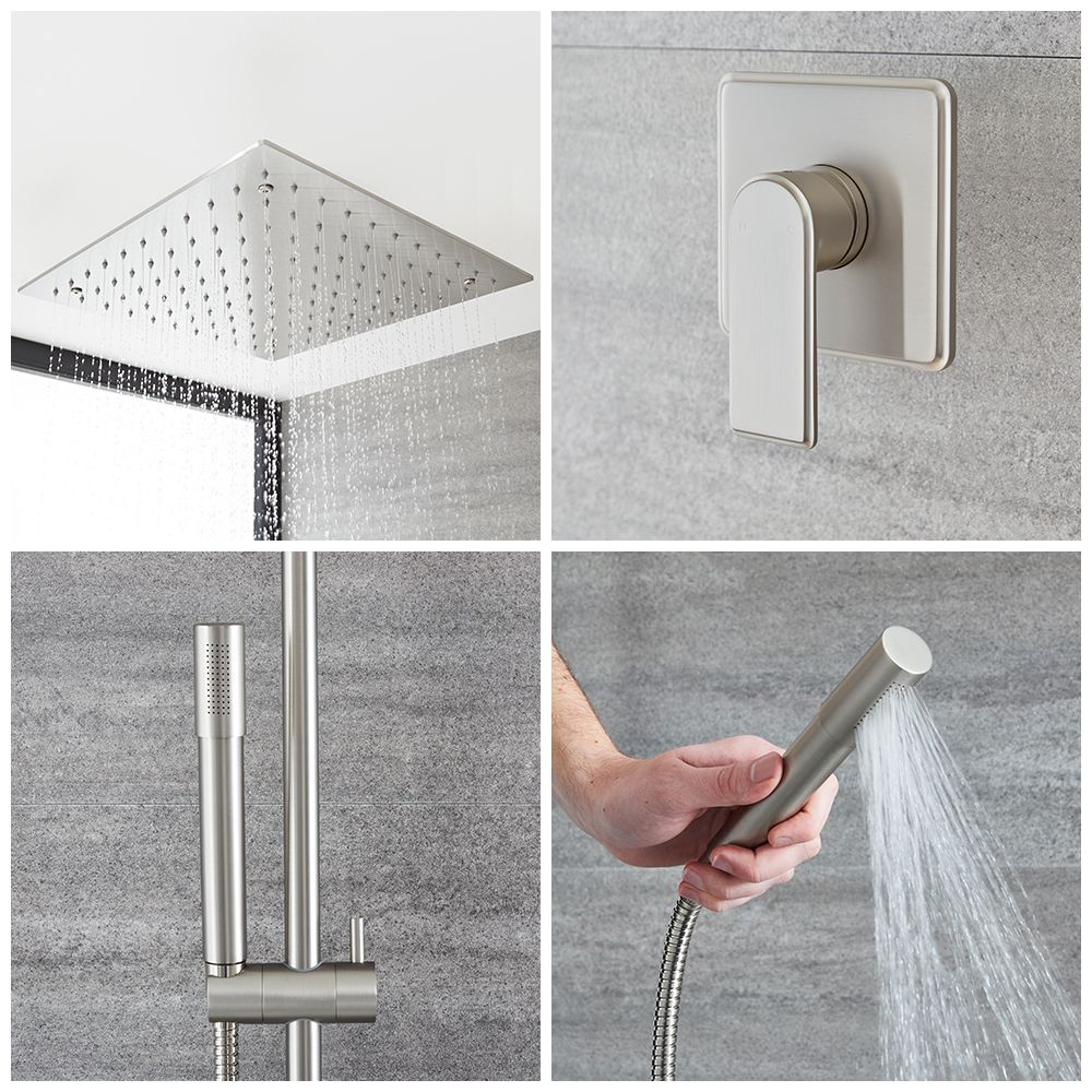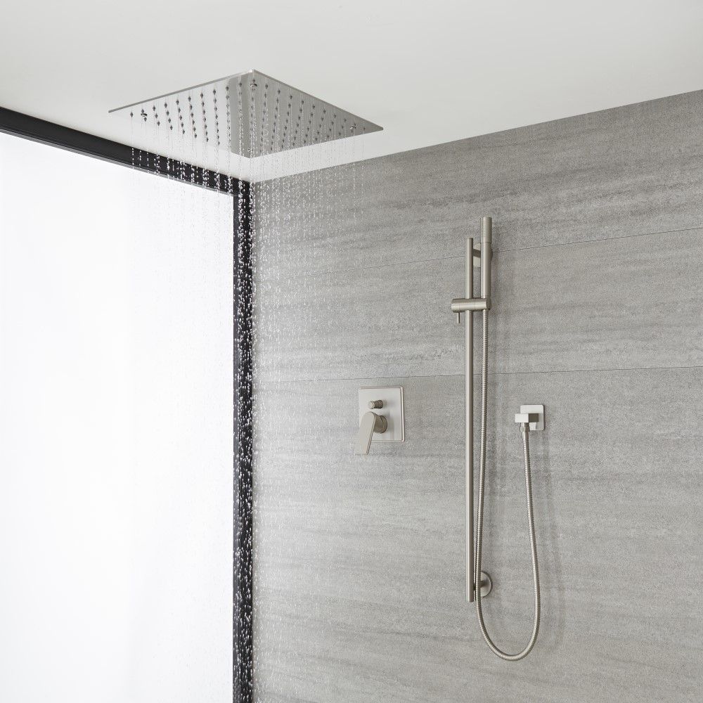 Enjoy a luxurious showering experience with the Milano Ashurst brushed nickel shower mixer set, complete with shower valve, 400mm recessed rainfall shower head and riser rail kit with hand shower.