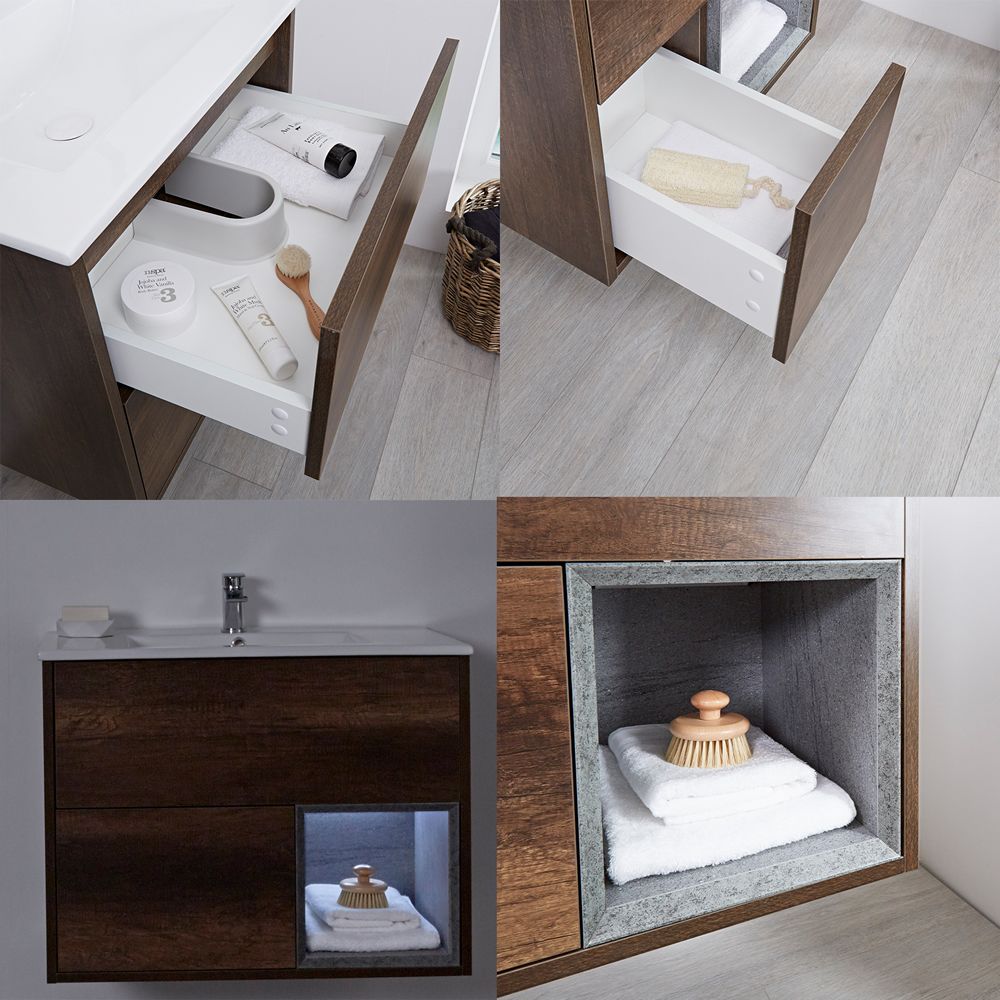 Made from highly durable moisture resistant engineered wood, the vanity sink unit features a gorgeous rich dark oak woodgrain effect finish and a space-enhancing wall-mounted design. There's plenty of storage space for your bathroom essentials too, thanks to the two push to open soft close drawers and an open shelf. The ceramic basin has a hard-wearing white glaze that's easy to clean and a single tap-hole that's perfect for use with any of our stylish and modern mono mixer taps.