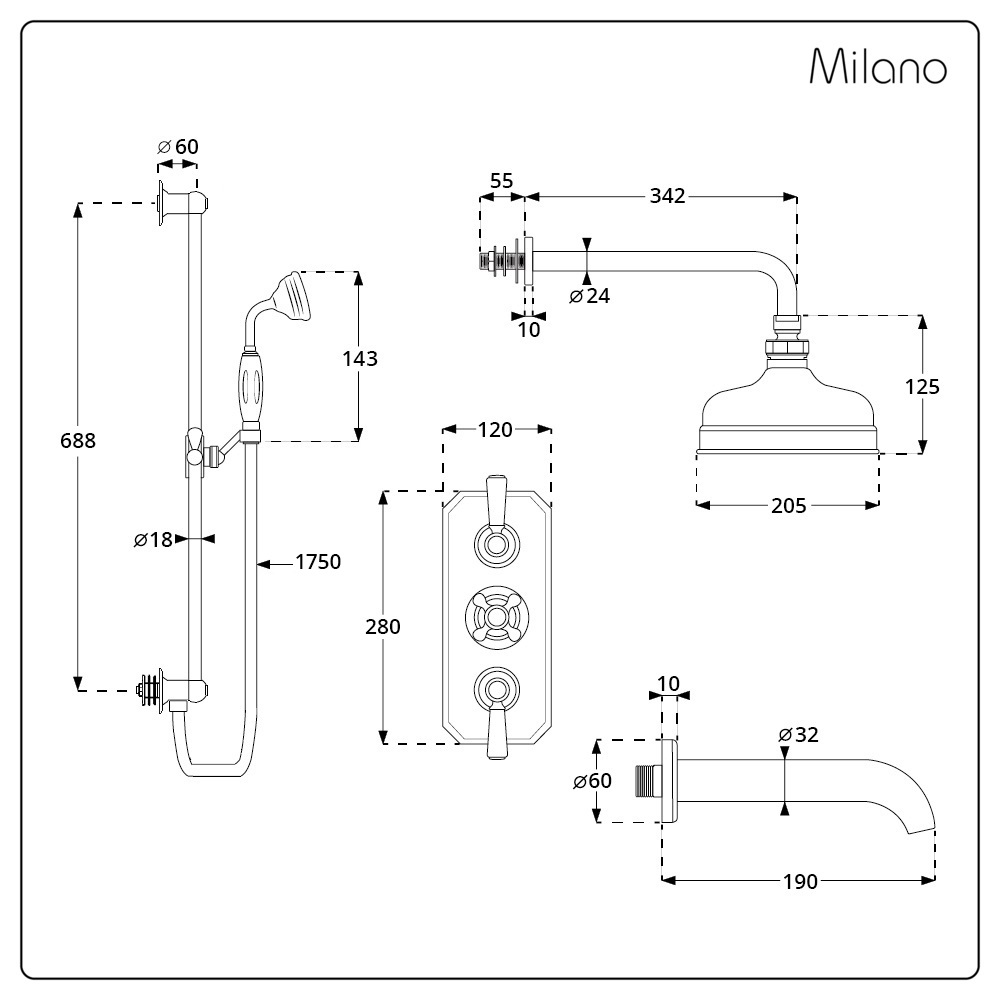 - Milano Elizabeth - Riser Rail Kit with Integrated Elbow, Hand Shower and 1.75m Hose