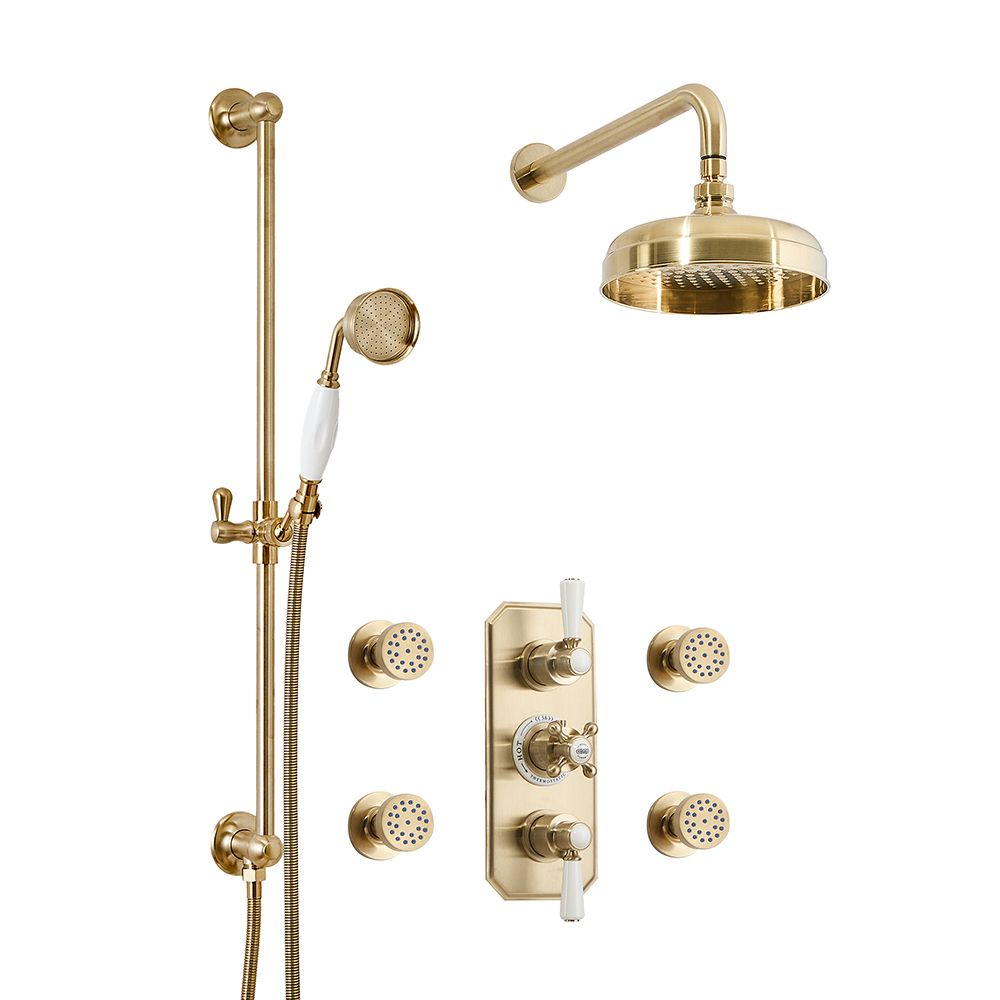 Milano Elizabeth - Brushed Brass Traditional Thermostatic Shower with Diverter, Shower Head, Body Jets and Riser Rail (3 Outlet)