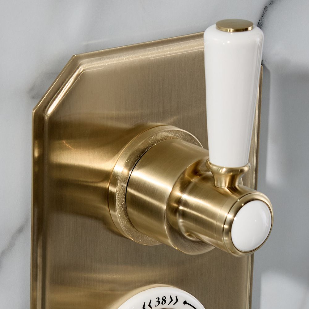 The Elizabeth shower valve has been made from solid brass for guaranteed durability and has a hard-wearing brushed brass finish with white ceramic detailing for a beautiful vintage look.