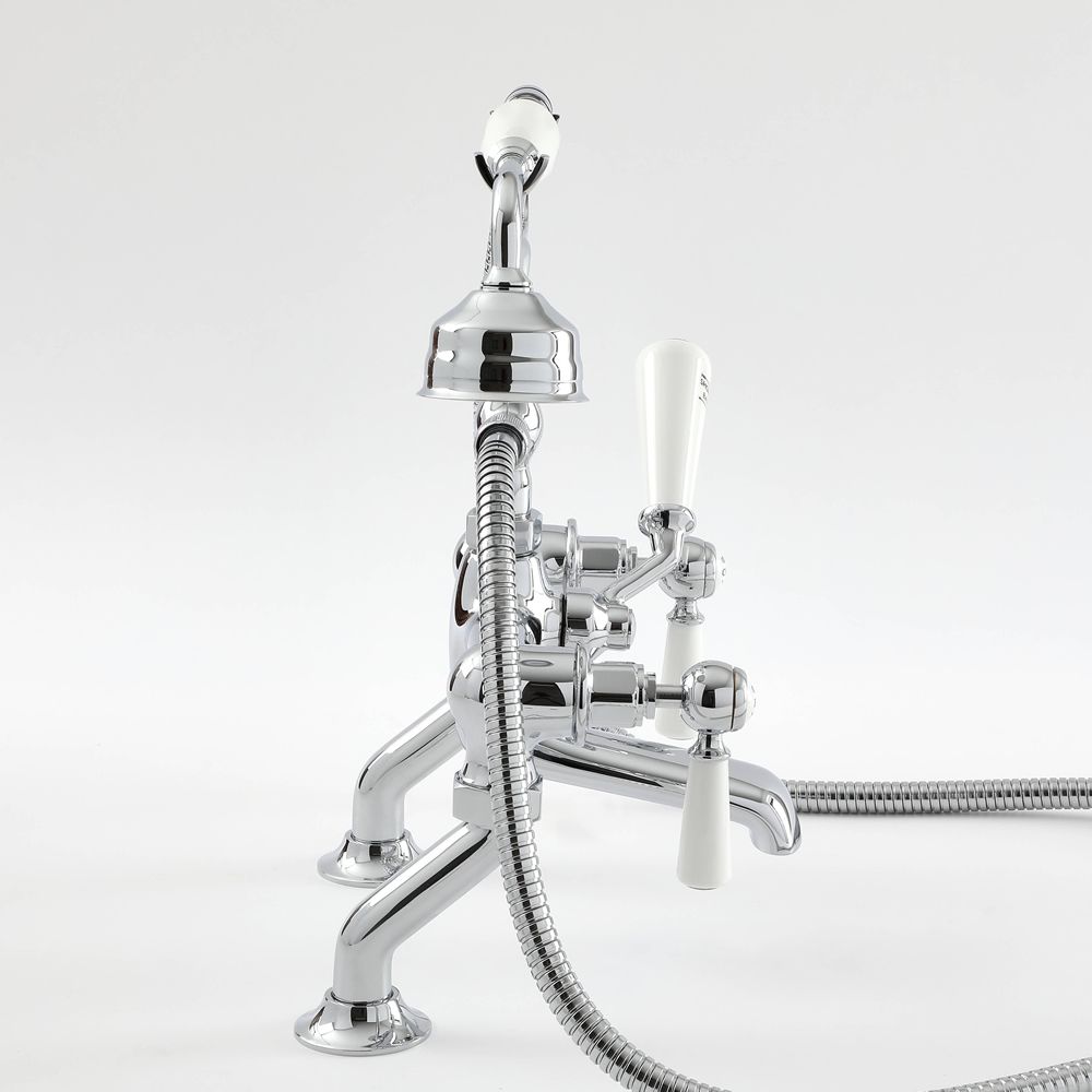 Crafted from solid brass, this beautifully designed mixer bath tap with shower is available in a choice of hard-wearing finishes including chrome/black and chrome/white to perfectly complement your bathroom décor - just make your selection from the above options.