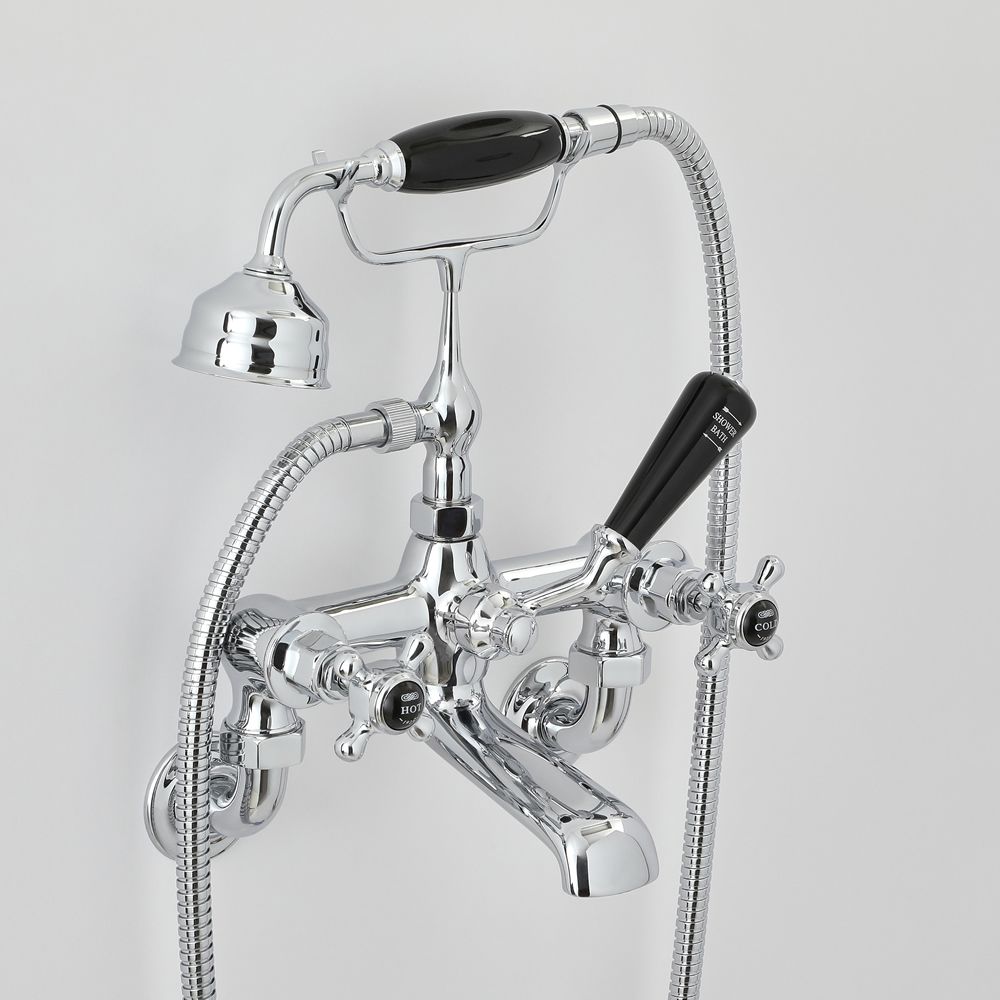 Crafted from solid brass, this bath shower mixer tap, complete with hand shower and 1.5m hose, features stylish crosshead handles with black ceramic indices. The hard-wearing chrome finish complements any bathroom decor, while the elegant design creates a look that will never fall out of fashion. What's more, the wall-mounted design frees up surface space around your bath, creating a neat and tidy finish.