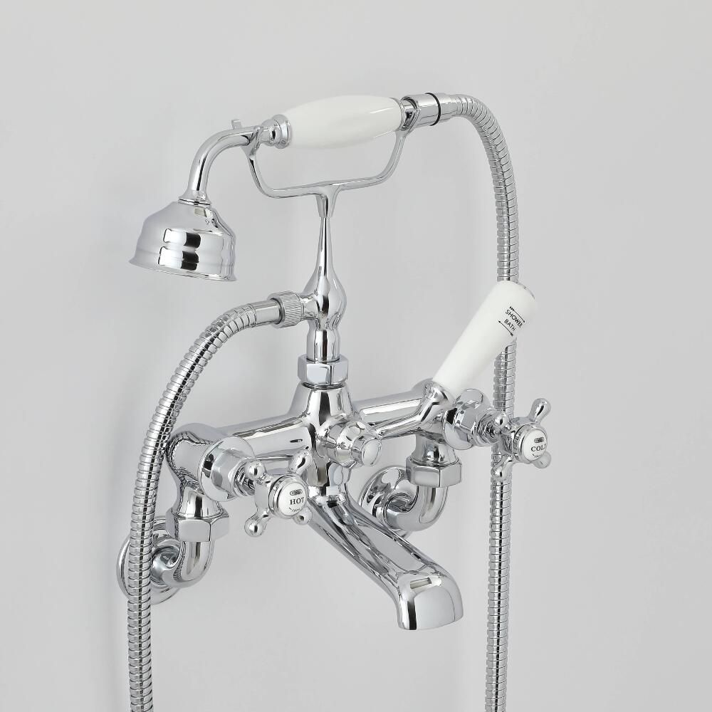 Crafted from solid brass for guaranteed durability, this bath shower mixer tap, complete with hand shower and 1.5m hose, features crosshead handles with white ceramic indices and a hard-wearing chrome finish that complements any bathroom decor. The tap also has an easy to use ceramic lever, which allows you to divert the water flow to the hand shower or bath spout,