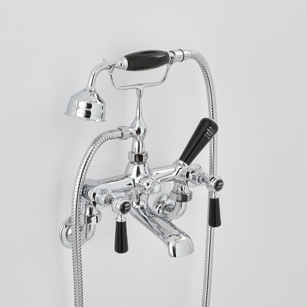 The Milano Elizabeth wall-mounted bath mixer tap with shower features a beautiful traditional design and a classic chrome and black finish.