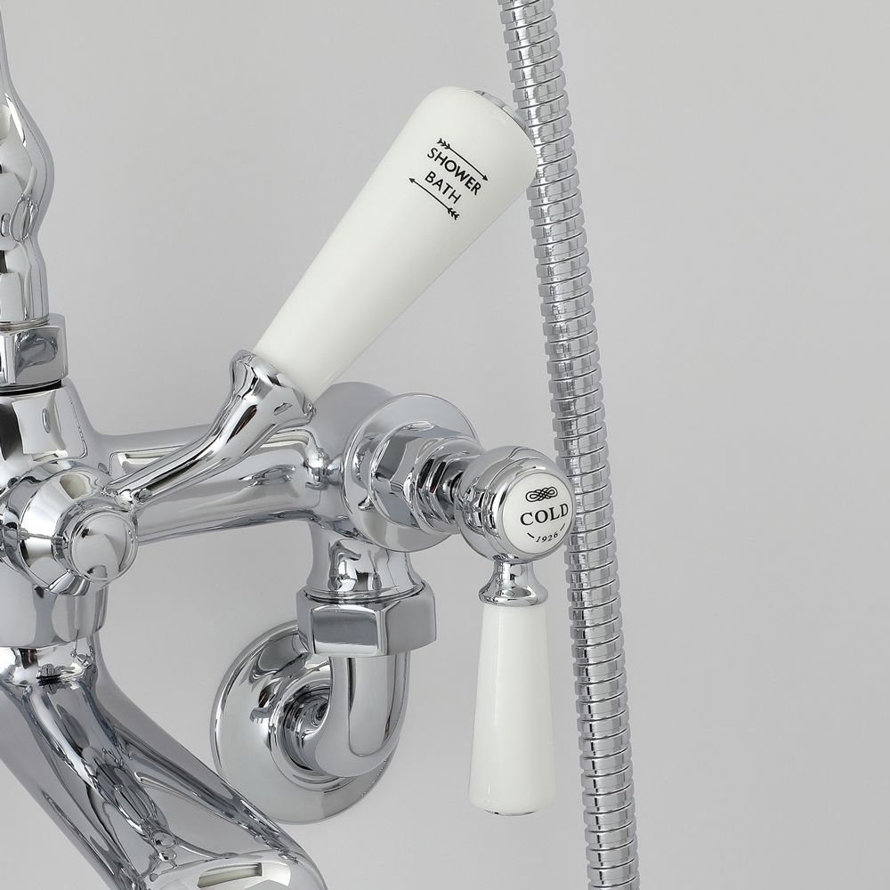 Crafted from solid brass, this bath shower mixer tap, complete with hand shower and 1.5m hose, features stylish white ceramic lever handles that provide effortless control and an elegant design that will never go out of fashion. The hard-wearing chrome finish complements any bathroom decor, while the wall-mounted design will free up surface space around your bath, creating a neat and tidy finish.
