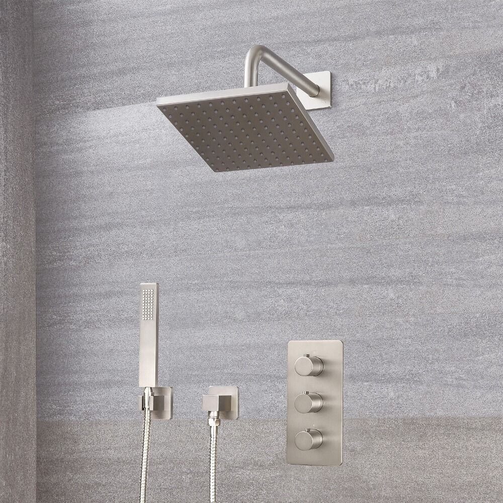 A great option for creating a designer look, the Milano Hunston thermostatic shower mixer valve, 200mm shower head and hand shower feature a brushed nickel finish and square lines.