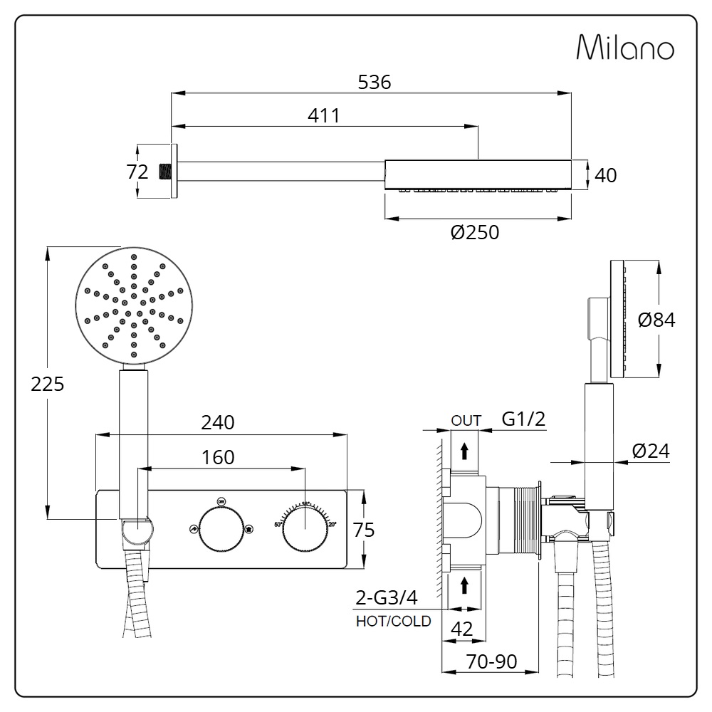 Enjoy a relaxing and soothing shower with the Milano Lune thermostatic shower system, complete with shower diverter valve, hand shower and 250mm round shower head.