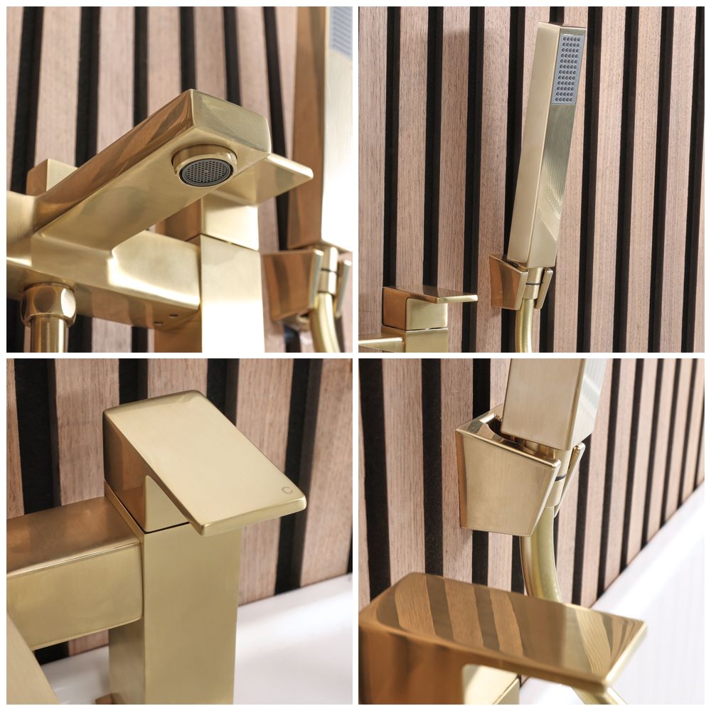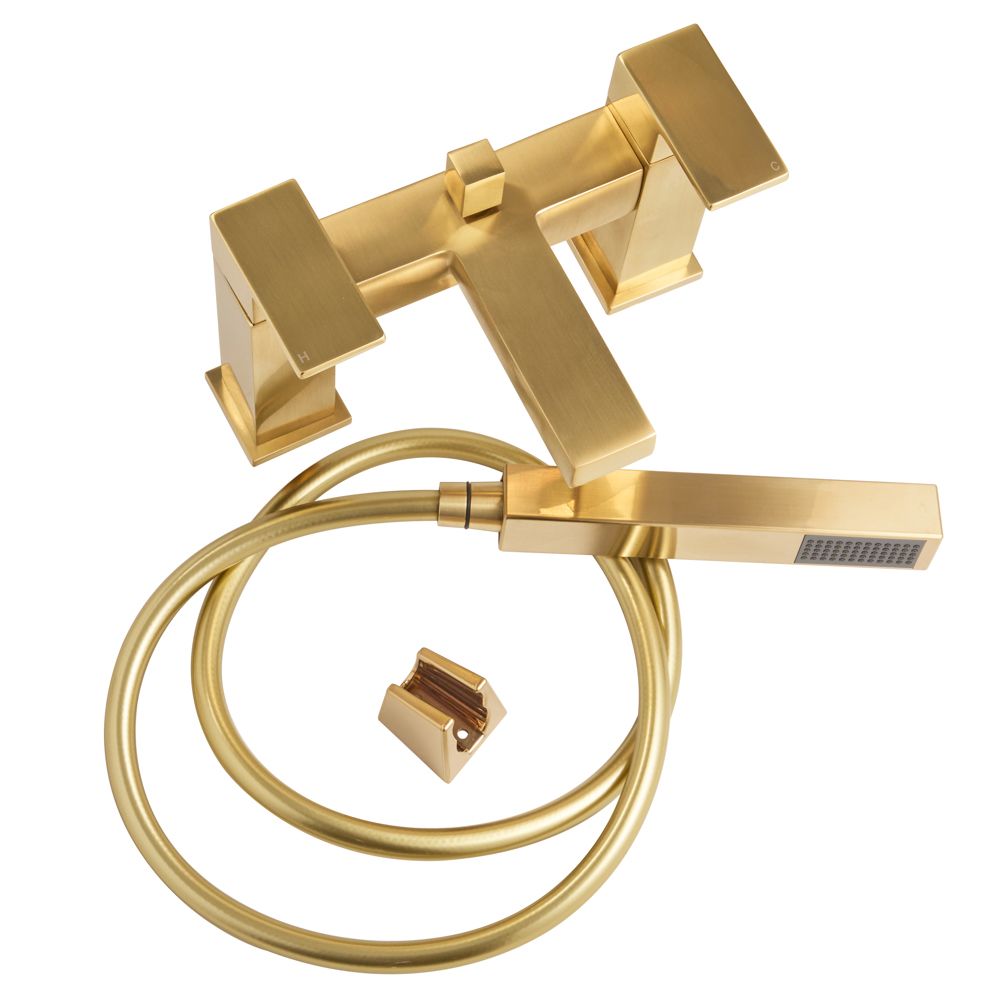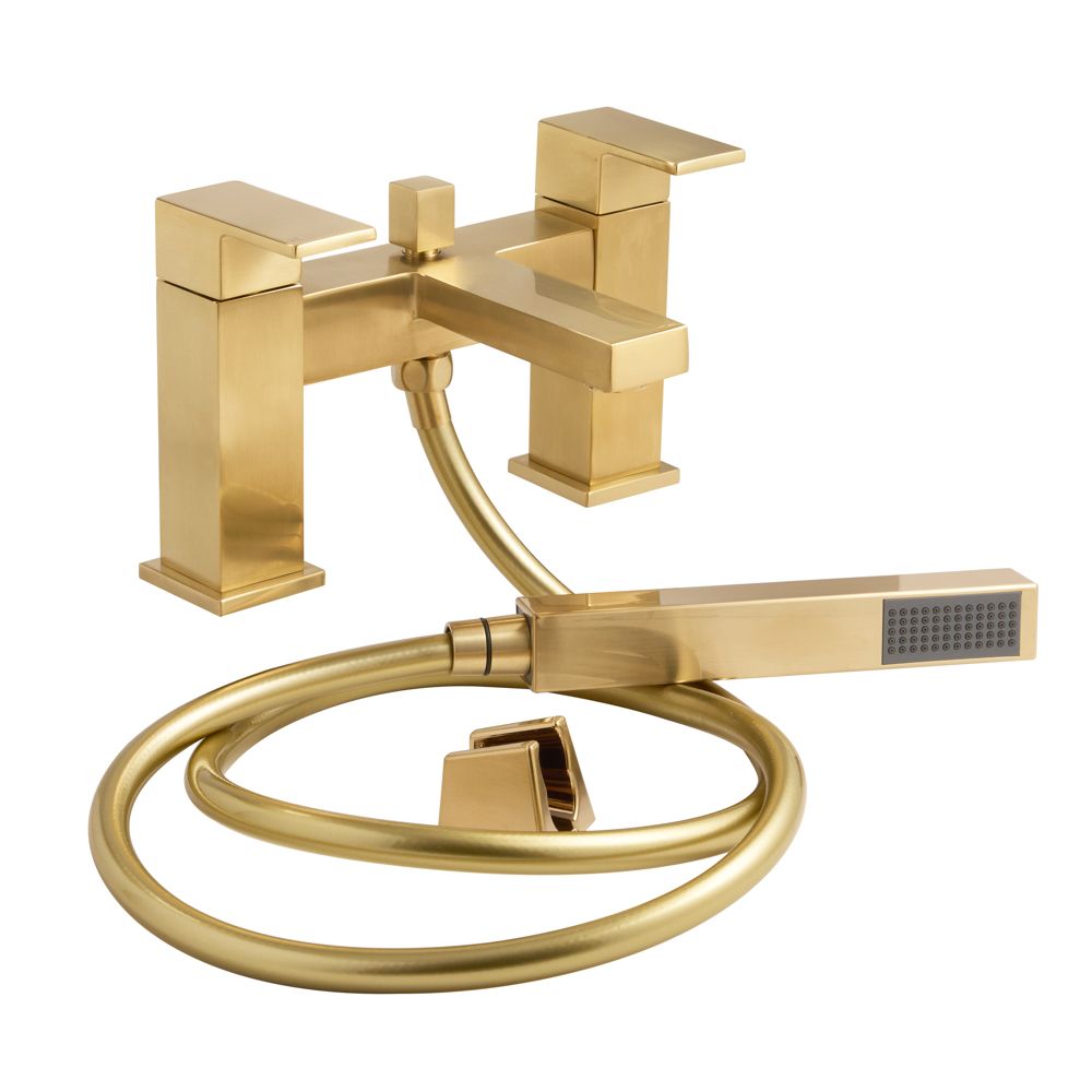 Elevate your modern bathroom with the Milano Lyra brushed brass bath shower mixer tap, complete with hand shower and hose.