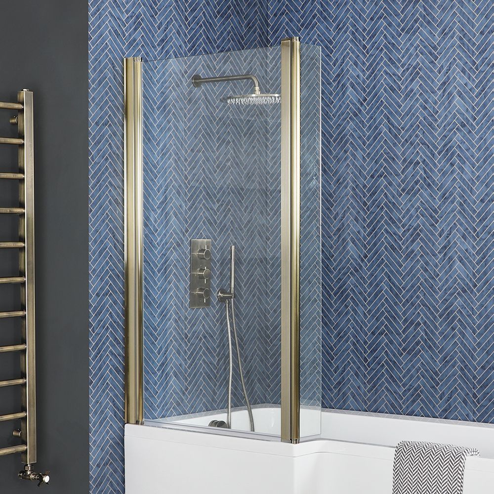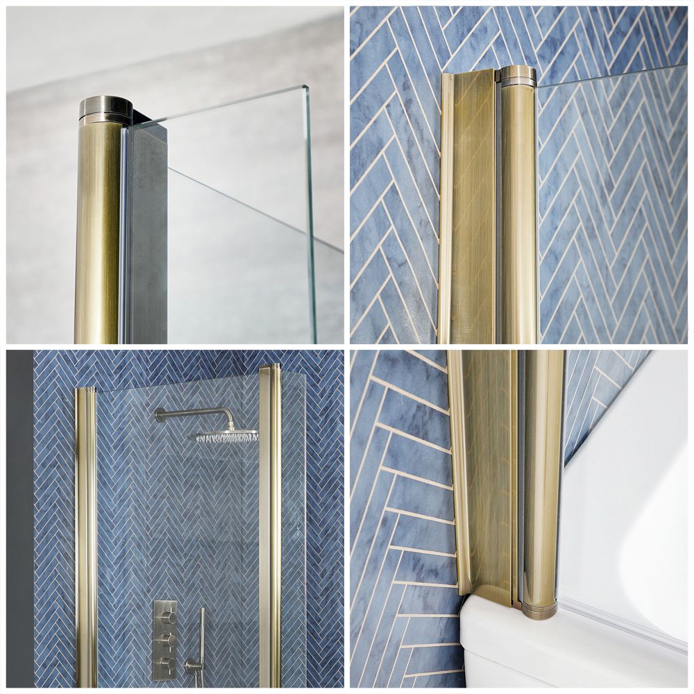 The stylish Milano Monet antique brass hinged L-shaped shower bath screen has been designed for use with square shower baths. It provides an effective way to keep your bathroom floor protected from spills and splashes when taking a shower.