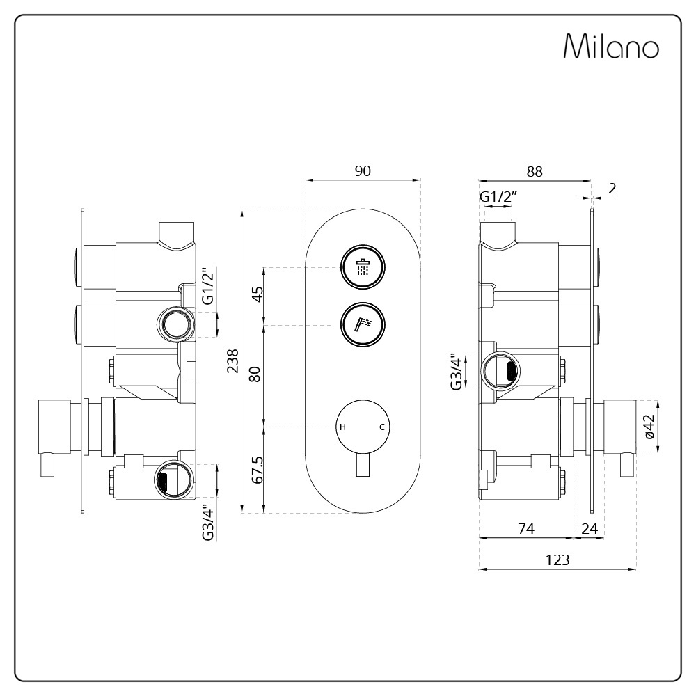 The Milano Orta two outlet push button thermostatic shower valve blends modern style with superb functionality.