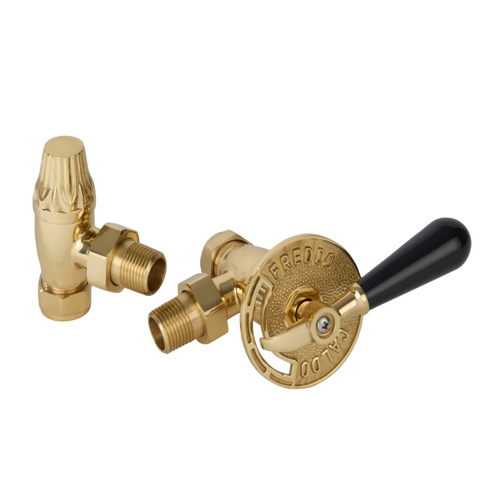Elevate your traditional style heated towel rail or column radiator with this pair of Milano polished brass thermostatic angled radiator valves.