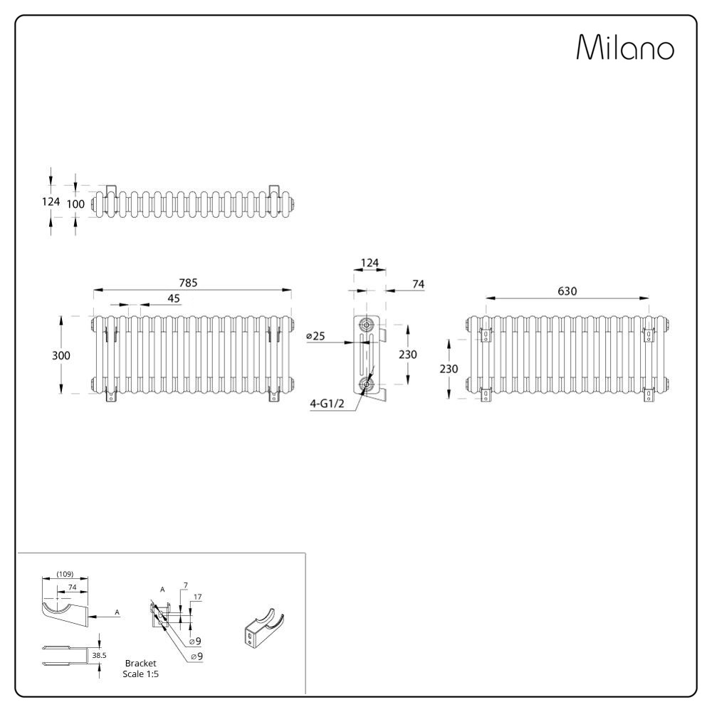 Milano Windsor - Lacquered Raw Metal Horizontal Traditional Column Radiator - 300mm x 785mm (Triple Column)
